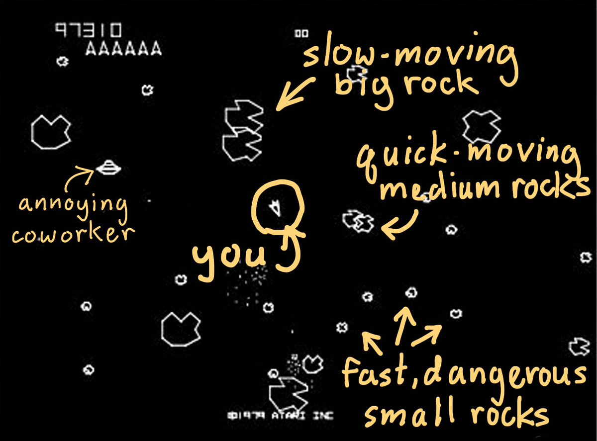 The worst technique in Asteroids is to break all the big rocks into medium rocks, and all the medium rocks into tiny rocks. The outcome, if you do this, is a screenful of fast moving, dangerous rocks that inevitably destroy your spaceship.